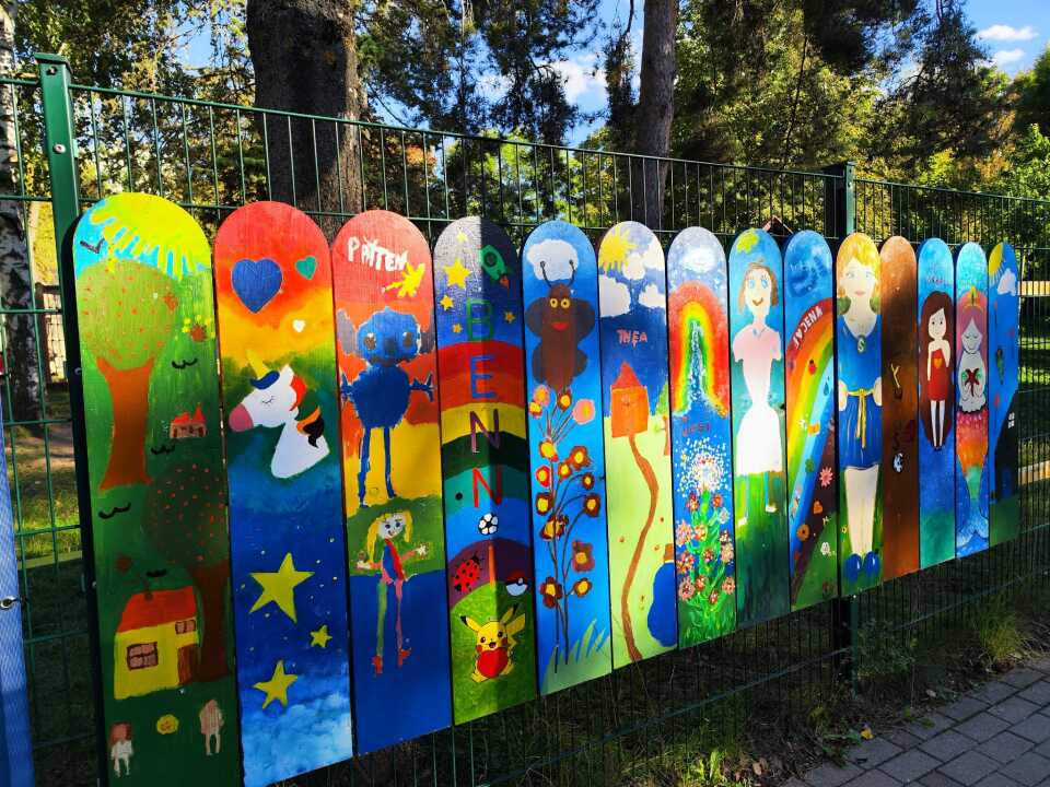 Unsere ehemaligen Kindergartenkinder kamen aus der Schule zu uns und konnten die Zaunlatten, die sie zuvor selbst gestaltet hatten, am Zaun anbringen. So kann jedes Kind Spuren hinterlassen und sich in seinem Ausdruck von Kreativität gesehen fühlen.